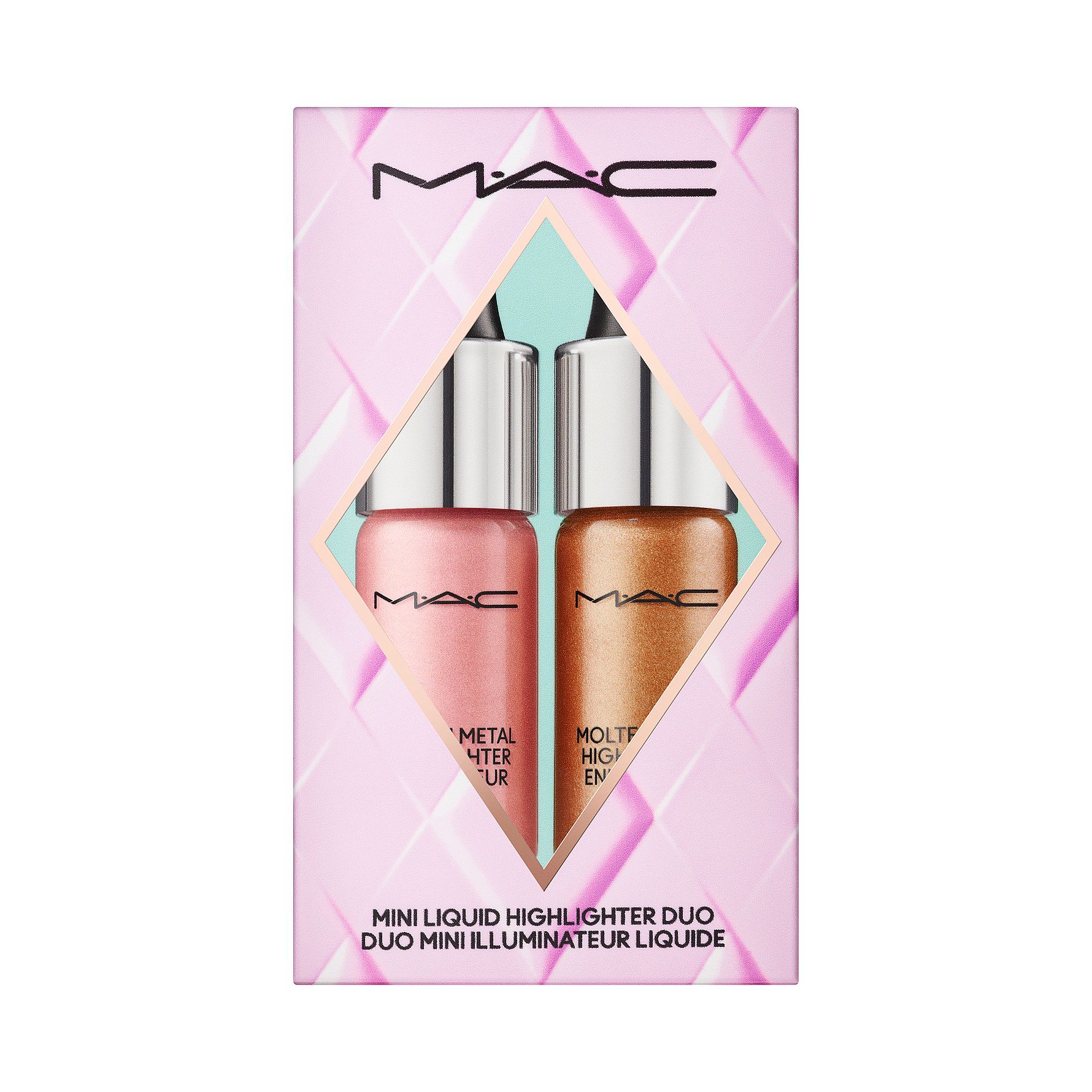 Surreal Shine Mini Highlighter Duo är ett set i begränsad upplaga med två helt nya nyanser av Molten Metal Highlighter i skimrande rosa och bronstoner.